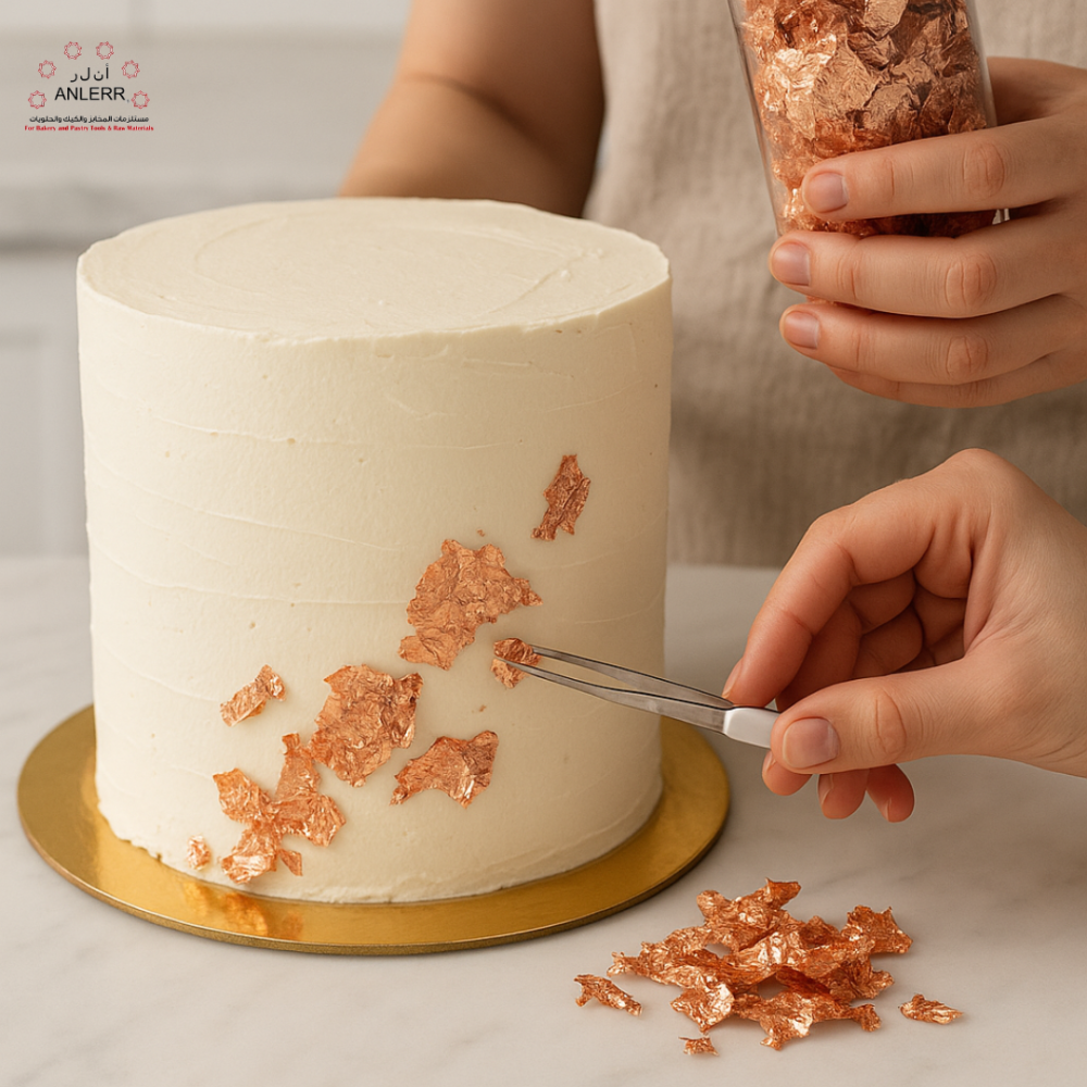 🎯 طريقة استخدام Rose Gold Foil Flakes لتزيين الكيك: